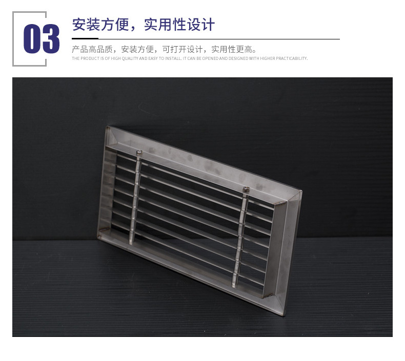 不銹鋼風(fēng)口通常也是指空調(diào)的回風(fēng)口,一般來(lái)說(shuō)它的后面都會(huì)帶著過(guò)濾網(wǎng),不銹鋼風(fēng)口表面還會(huì)有黑色的灰塵積在角落里,很容易區(qū)分出風(fēng)口是空調(diào)系統(tǒng)中送風(fēng)用的,一般它的后面不會(huì)帶過(guò)濾網(wǎng),表面會(huì)很干凈,送冷風(fēng)時(shí)可能還會(huì)有冷凝水積聚在上面;不銹鋼風(fēng)口通常也是指空調(diào)的回風(fēng)口,一般來(lái)說(shuō)它的后面都會(huì)帶著過(guò)濾網(wǎng),不銹鋼風(fēng)口表面還會(huì)有黑色的灰塵積在角落里,很容易區(qū)分;新不銹鋼風(fēng)口是用風(fēng)機(jī)把外面的自然風(fēng)直接送到所需區(qū)域,一般也帶著過(guò)濾網(wǎng);出風(fēng)口一般為方形散流器,呈方形多層可拆卸,一般用防火帆布連接;送冷風(fēng)時(shí)水珠掛在上面!有回風(fēng)口多呈長(zhǎng)方形,有稱單(雙)層百葉風(fēng)口,并帶有過(guò)濾網(wǎng);主要作用在于把污濁的空氣吸回去。新不銹鋼風(fēng)口則較小,每個(gè)房間貼墻安裝或是于送風(fēng)口呈直線的必是新風(fēng)口無(wú)疑!